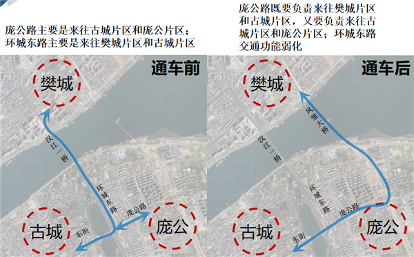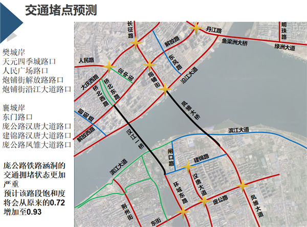 預(yù)計鳳雛大橋開通后,襄城龐公路和樊城廣場路口車流量大幅增加,交警部門經(jīng)過對周邊路網(wǎng)及主要流向分析研判,襄城區(qū)易堵點為東門涵洞、龐公路沿線路口,樊城區(qū)主要堵點為廣場路口、炮鋪街與解放路口及沿江大道路口。為此交警部門對大橋樊城一側(cè)做出通行調(diào)整。
